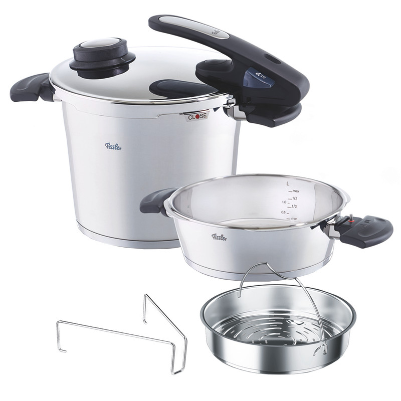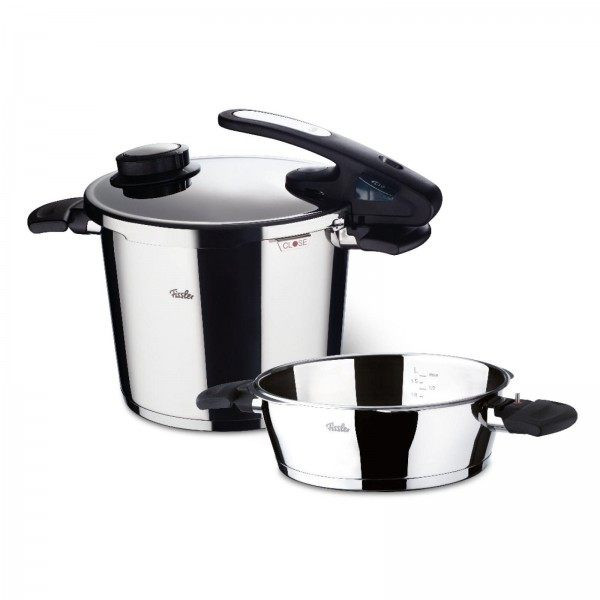 در زودپز های فیسلر تکنولوژی پیشرفته زیادی وجود دارد که کار با آن را آسان و راحت می کند تا از آشپزی لذت ببرید . با استفاده از تکنولوژی پیشرفته امنیتی ، هیچ چیز نمی تواند به اشتباه برسد . تا 70٪ از زمان پخت و پز را کاهش می دهد و این کار باعث می شود ویتامین ها و مواد معدنی تا حد زیادی حفظ شود . اگر درب به درستی بسته شده باشد صدای “کلیک” شنیده می شود و یک صفحه نمایش رنگی در دسته از قرمز به سبز تغییر می کند . 2 درجه روی درب برای پخت مواد دیرپز و زودپز روی درب قرار دارد مرحله 1 برای غذاهای حساس مانند سبزیجات یا ماهی و مرحله 2 پخت و پز سریع برای گوشت و خورشت است . نشانگر روی درب مانند چراغ راهنمایی باعث می شود آشپزی با زودپز کاملا بی خطر باشد . زرد : در حال پختن است . سبز : دمای تنظیم شده رسیده است و زمان پخت و پز آغاز می شود . قرمز: درجه حرارت خیلی زیاد است و فشار بالایی در دیگ جمع شده و باید شعله کم شود . دارای درجه بندی در داخل دیگ از کم تا زیاد .