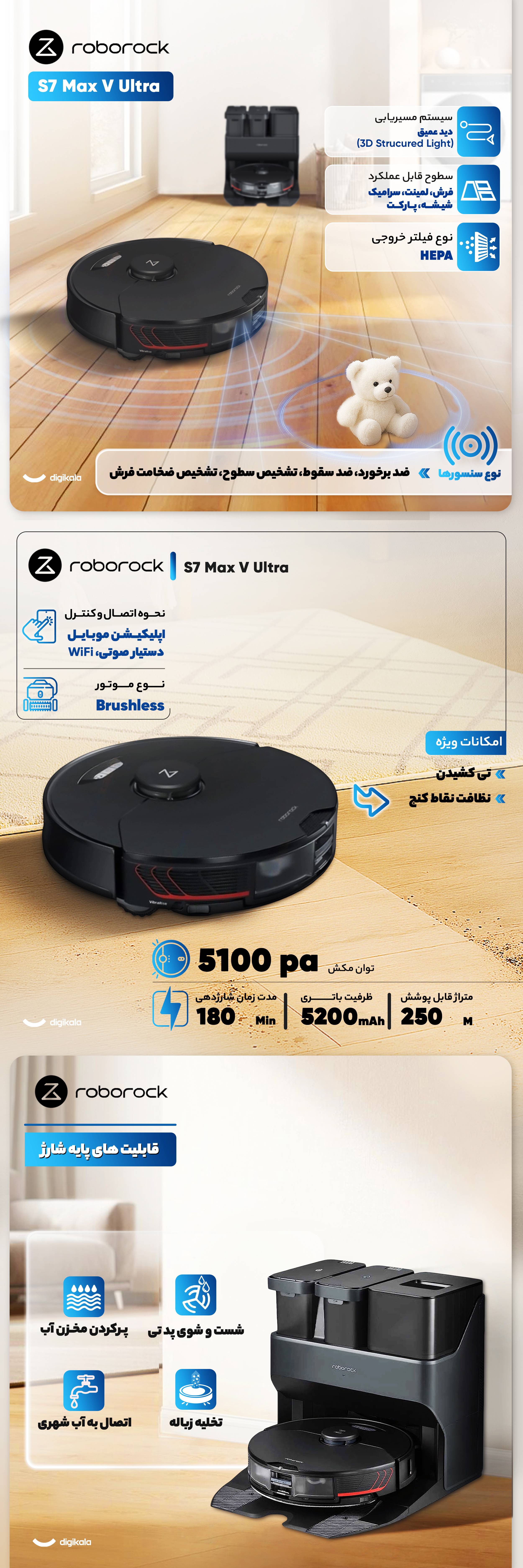 | سایر توضیحات | ویژگیهای جارو رباتیک S7 Max V Ultraسیستم هوش مصنوعی ReactiveAI 2.0دو مخزن اصلی برای گرد و غبار و شست و شودارای یک طی ضربهکشی(3000 بار در دقیقه) |