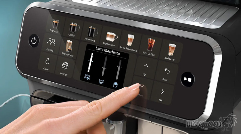 ✨ نمایشگر لمسی با آیکونهای گرافیکی، امکان انتخاب نوشیدنی، تنظیم غلظت، دمای آب، حجم فنجان و شدت عطر را بهصورت دقیق و ساده فراهم میکند.