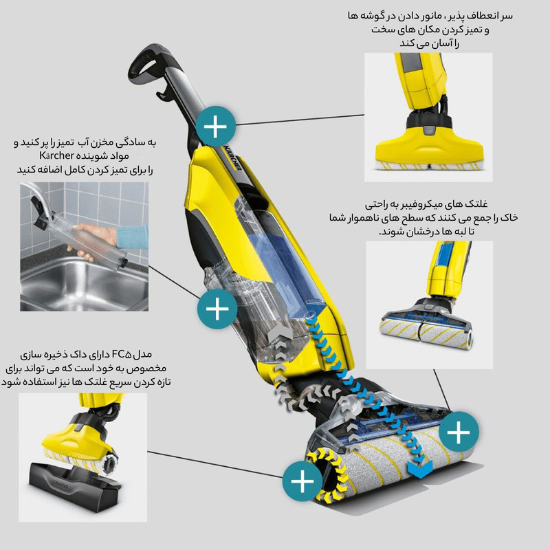 ✨ زمین شوی FC5 چندتومنی از برند معتبر Karcher آلمان، یک دستگاه ترکیبی برای شستوشو و مکش همزمان سطوح سخت است که فرآیند نظافت را سریعتر و مؤثرتر میسازد.