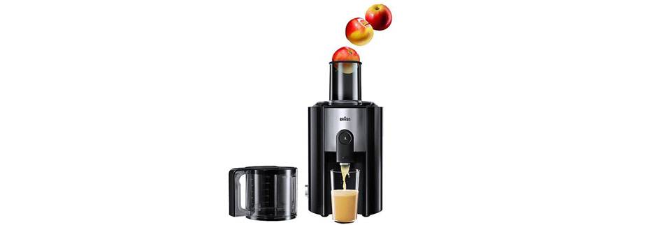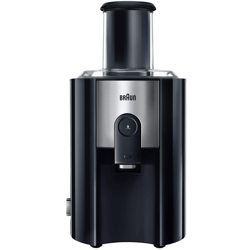 آبمیوهگیری براون مدل «J500» یکی از آبمیوهگیریهای تککاره موجود در بازار است. این دستگاه از بدنهای از جنس پلاستیک بادوام و استیل ساخته شده و استحکام خوبی دربرابر ضربه دارد. قسمت ورودی میوهها در بخش بالایی دستگاه واقع شده است که با قطر زیادی که دارد، میتواند بهآسانی قطعات بزرگ میوه را از خود عبور دهد. این ویژگی کار با دستگاه را آسانتر کرده و به آن سرعت بخشیده است. در طراحی این محصول استوانهای در نظر گرفته شده که پس از قرار دادن میوه بر دهانه ورودی دستگاه میتوان با استفاده از آن میوه را به سمت تیغهها هل داد.