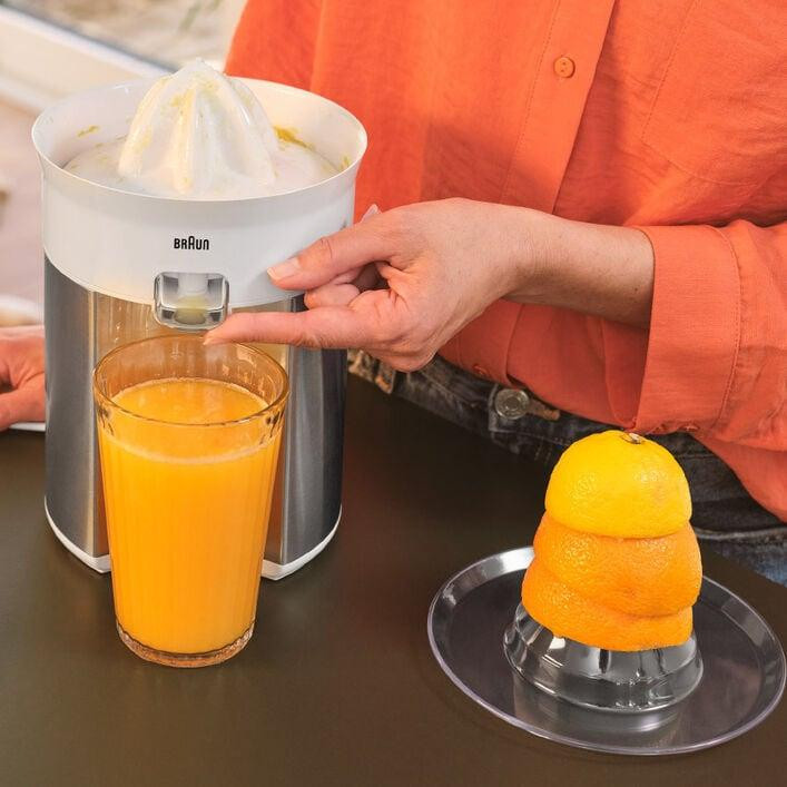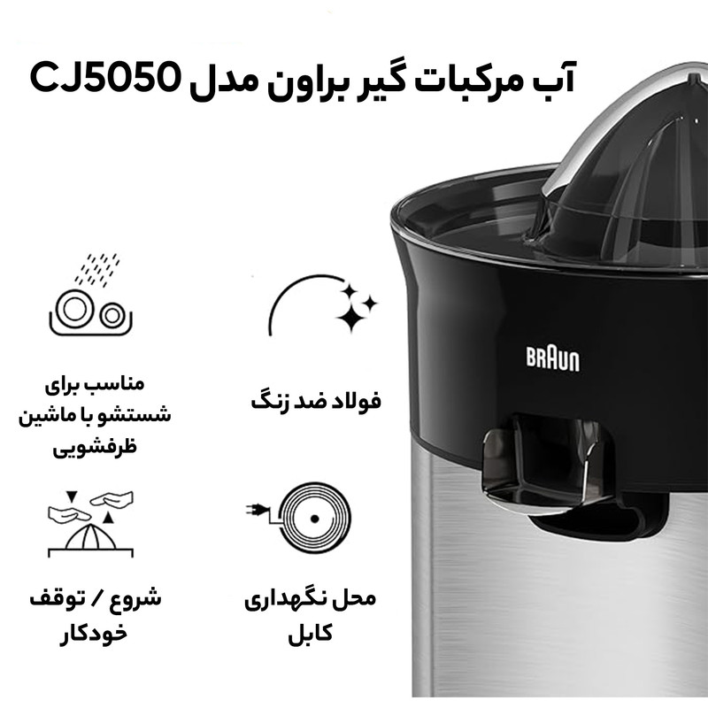 ✨ آب مرکباتگیر براون مدل CJ5050 دارای عملکرد **روشن و خاموش خودکار** است؛ بهمحض فشار دادن میوه روی مخروط، دستگاه شروع به کار میکند و با رها کردن آن خاموش میشود.